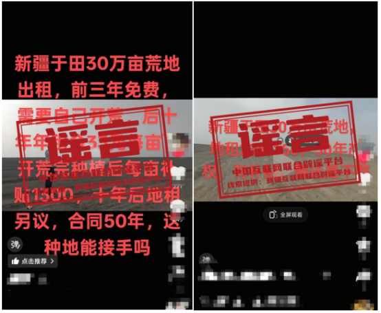 真相:近日,有网民在网络上发布信息称“新疆于田30万亩荒地出租,前三年免费,需要自己开荒,开荒完种植后每亩补贴1300元,合同50年”,引发社会关注。经新疆于田县自然资源局核实,网传信息系谣言。目前于田县自然资源局未曾与任何企业或个人签订30万亩土地承包合同,也未曾发布过任何相关信息。(来源:“新疆网络辟谣”微信公众号、和田网络举报辟谣)