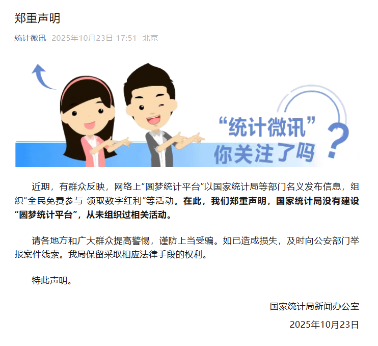 近期,有群众反映,网络上“圆梦统计平台”以国家统计局等部门名义发布信息,组织“全民免费参与 领取数字红利”等活动。对此,国家统计局新闻办公室发布郑重声明。全文如下: