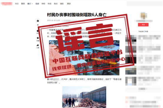 真相:近日,有网民在互联网平台发布信息称“9月8日,重庆大足区龙石镇石马村,围墙倒塌致6人身亡”,引发关注。经向大足区相关部门核实,该区龙石镇石马村未发生围墙倒塌致人死亡事件。目前,警方正对造谣者展开调查。(来源:“重庆辟谣”微信公众号)