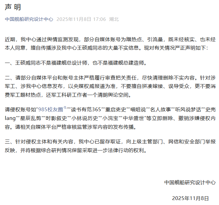 中国舰船研究设计中心11月8日发布声明: