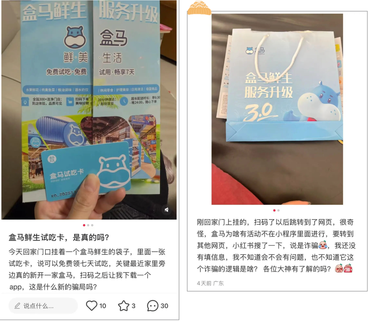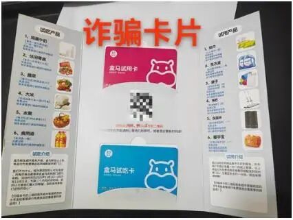 据了解,诈骗分子模仿知名生鲜品牌“盒马”制作了精美的“盒马试用卡”或“盒马试吃卡”,通过线下派送等方式,广泛投递到居民家中。卡片上通常印有二维码,以“扫码兑奖”、“免费试用”等极具诱惑力的字眼吸引眼球。