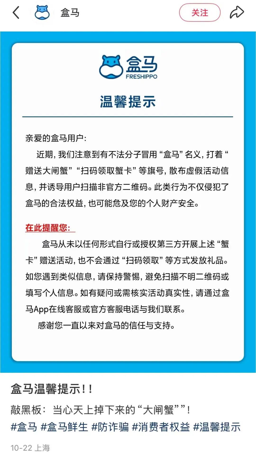 盒马此前已发布提示称,盒马不会通过扫码领取等方式发放礼品,消费者遇到此类情况应避免扫描不明二维码或填写个人信息。