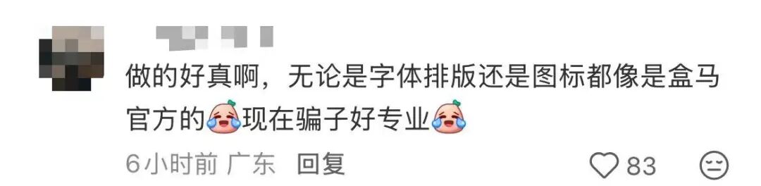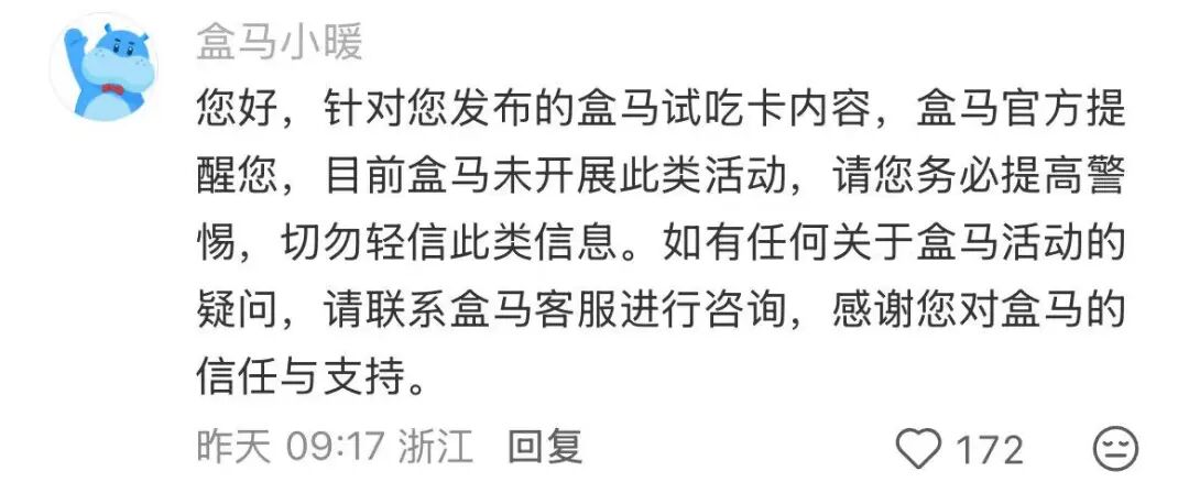 盒马相关负责人也表示,目前盒马未开展此类活动,请消费者务必提高警惕,切勿轻信此类信息,如有任何关于盒马活动的疑问及需要核实真假,可咨询盒马客服。