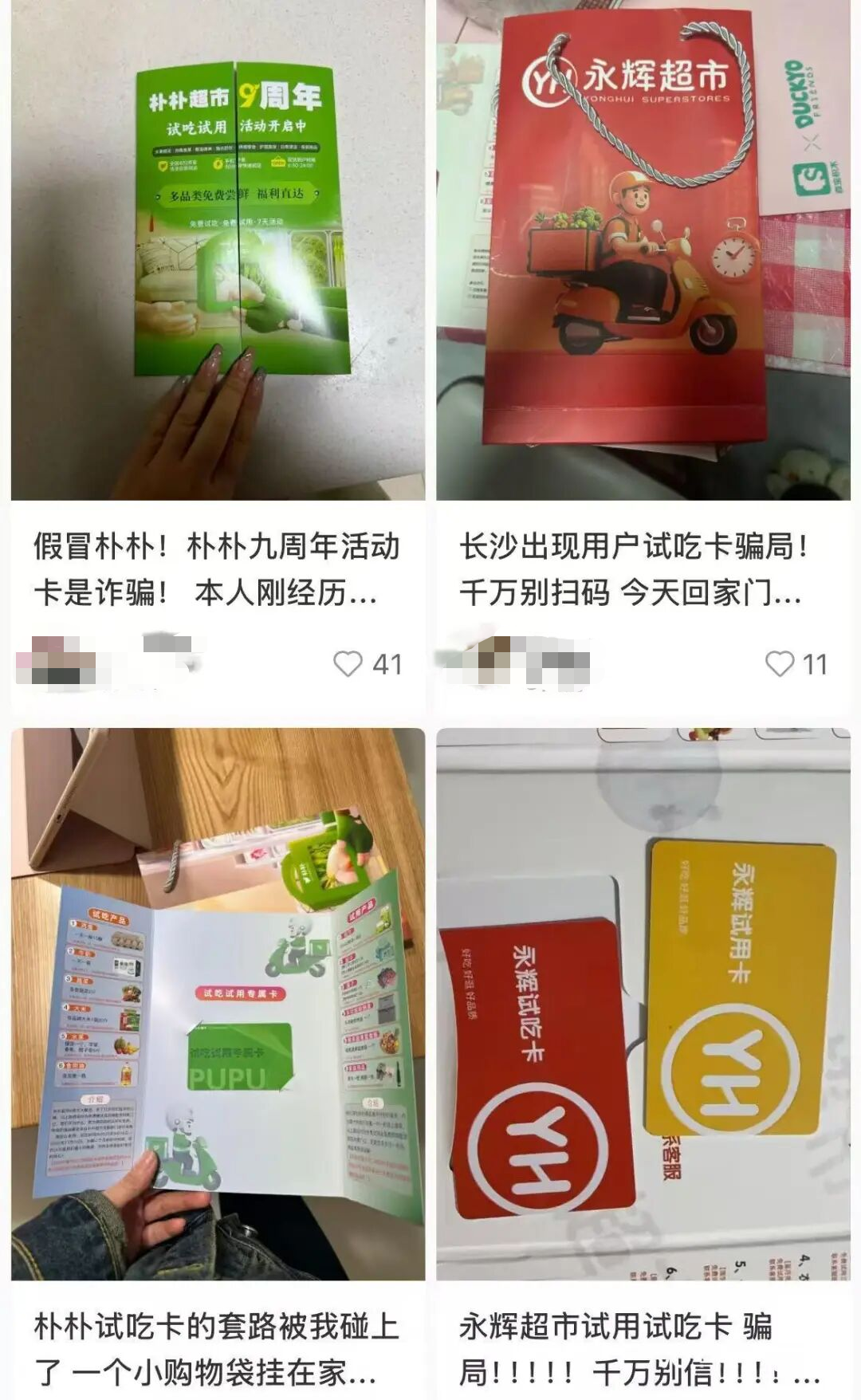 除了盒马外,记者留意到,近日也有多位网友在社交平台发帖称,收到了朴朴超市、永辉超市等平台的“免费试吃卡”“免费体验卡”等。