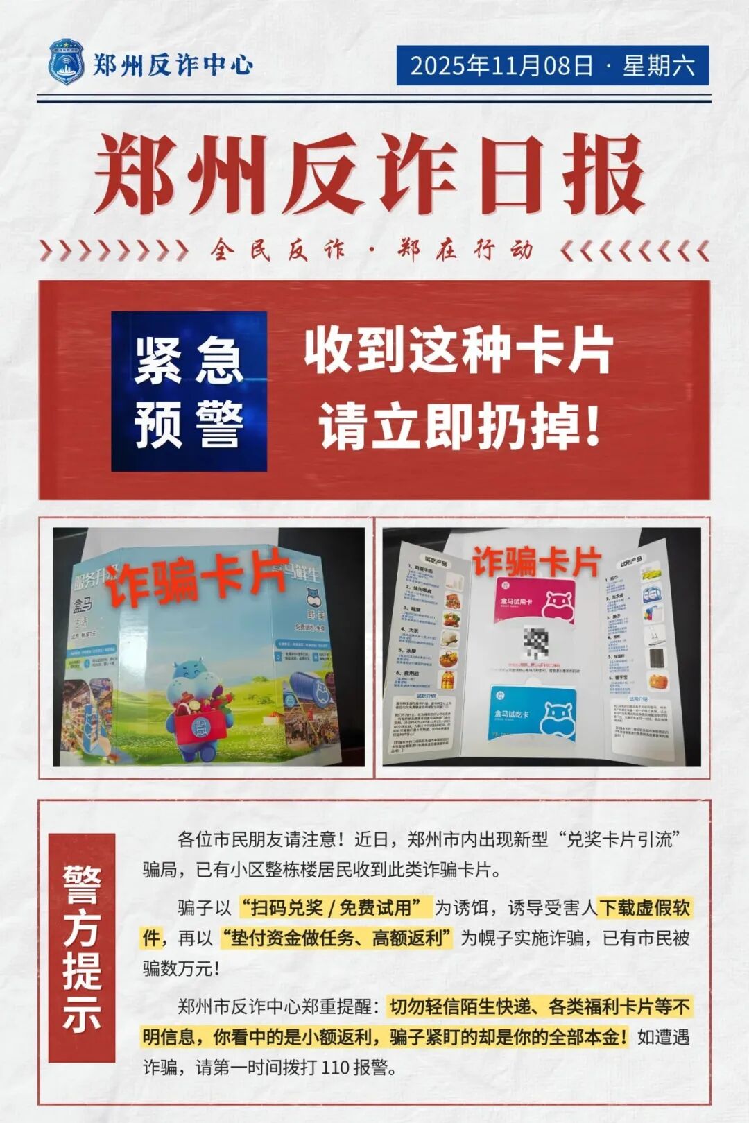 据郑州反诈中心,此类新型“兑奖卡片引流”骗局在郑州市内出现,已有多个小区整栋楼居民收到此类诈骗卡片,并有市民因此被骗数万元。