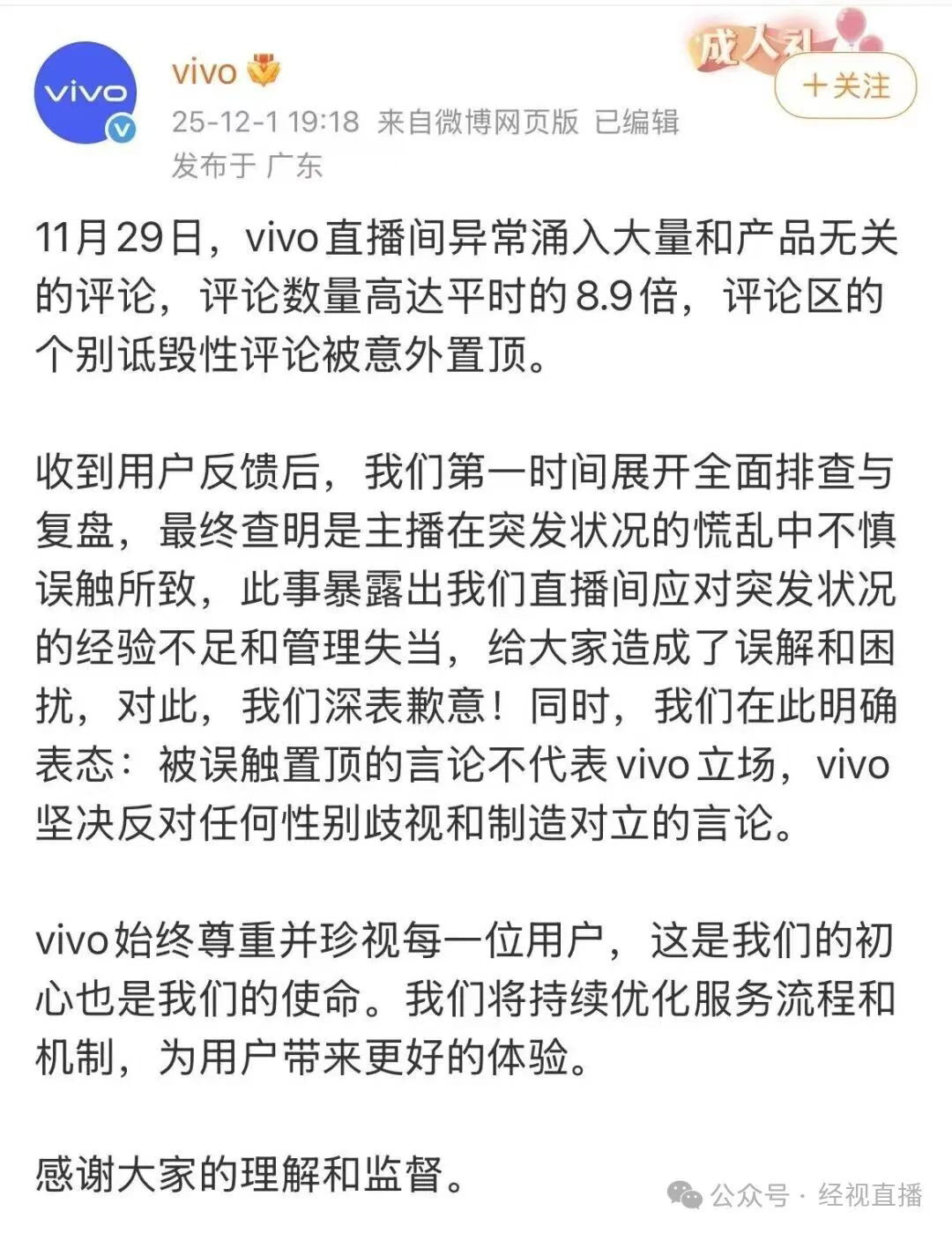 11月29日,vivo直播间异常涌入大量和产品无关的评论,评论数量高达平时的8.9倍,评论区的个别诋毁性评论被意外置顶。收到用户反馈后,我们第一时间展开全面排查与复盘,最终查明是主播在突发状况的慌乱中不慎误触所致,此事暴露出我们直播间应对突发状况的经验不足和管理失当,给大家造成了误解和困扰,对此,我们深表歉意!同时,我们在此明确表态:被误触置顶的言论不代表vivo立场,vivo坚决反对任何性别歧视和制造对立的言论。vivo始终尊重并珍视每一位用户,这是我们的初心也是我们的使命。我们将持续优化服务流程和机制,为用户带来更好的体验。感谢大家的理解和监督。、