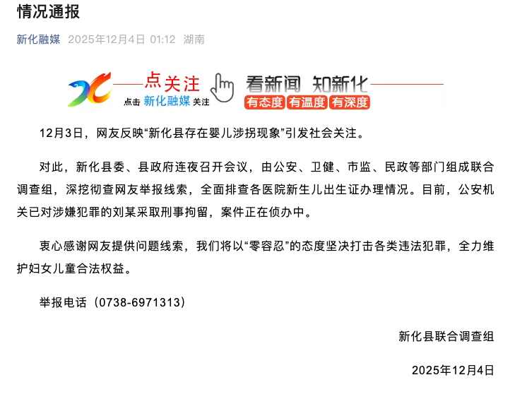 12月3日,网友反映“新化县存在婴儿涉拐现象”引发社会关注。