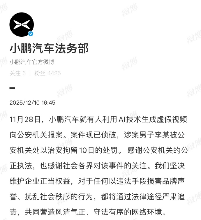 11月28日,小鹏汽车就有人利用AI技术生成虚假视频向公安机关报案。案件现已侦破,涉案男子李某被公安机关处以治安拘留10日的处罚。感谢公安机关的公正执法,也感谢社会各界对该事件的关注。我们坚决维护企业正当权益,对于任何以违法手段损害品牌声誉、扰乱社会秩序的行为,都将通过法律途径严肃追责,共同营造风清气正、守法有序的网络环境。