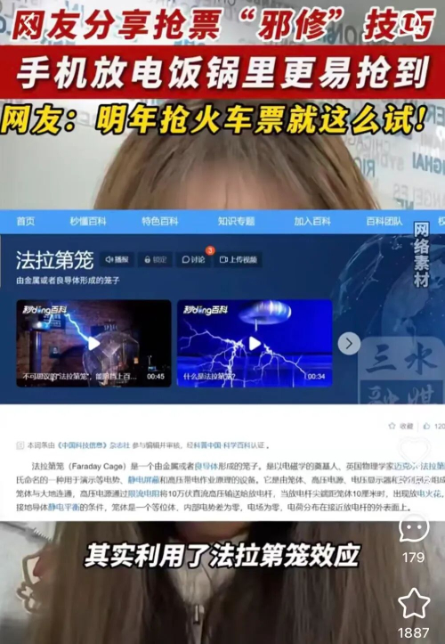 的确,面对抢票这种不确定性强、竞争激烈的情境,许多人会尝试寻找各种邪修方法,于是各类未经验证的玄学技巧不断出现并迅速传播,其中最为典型的一种,就是把手机放进电饭锅或微波炉,以期改善网络状况,还煞有其事说这是法拉第笼效应。那么这种方法有道理吗?