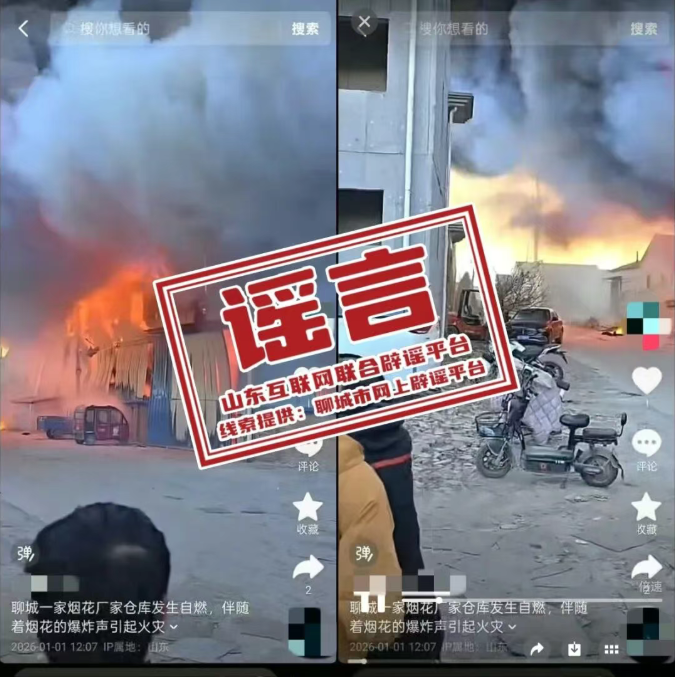 近日,聊城网信、公安部门巡查发现,有网民称聊城一家烟花厂家仓库发生自燃,相关火灾及爆炸视频在互联网传播。经调查发现,该信息不实,网民石某某为博取眼球,使用自己的账号编造并发布了内容为“聊城一家烟花厂家仓库发生自燃”的谣言,引发当地居民恐慌,造成严重不良社会影响。当地公安机关依法给予石某某行政处罚。