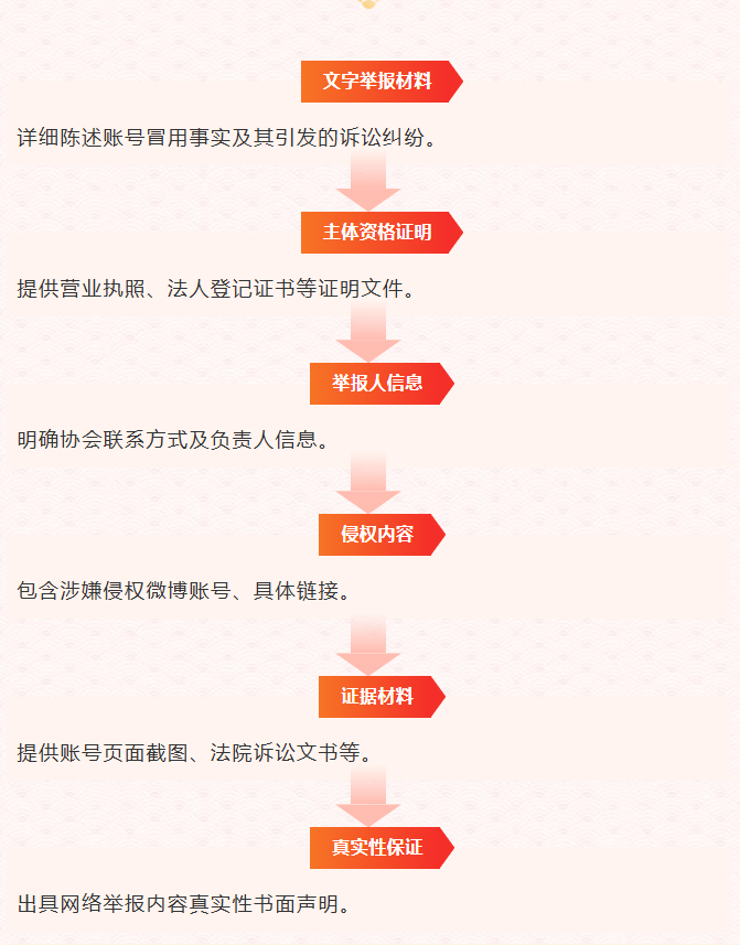 该协会在举报过程中,严格按照《网站平台受理处置涉企网络侵权信息举报工作规范》要求,提交以下6个要件,为后续快速精准处置奠定坚实基础。