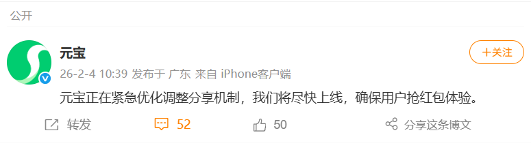 对此,元宝官微随后发文称:正在紧急优化调整分享机制,我们将尽快上线,确保用户抢红包体验。