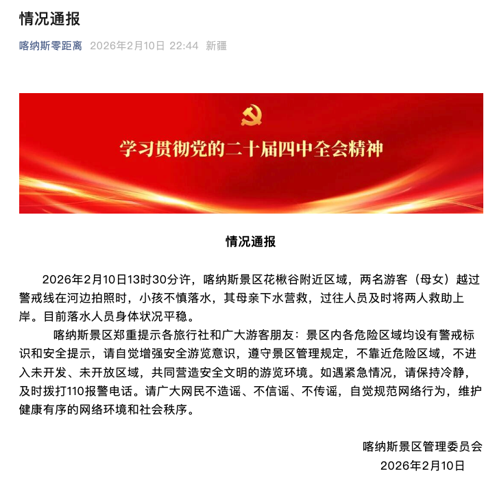 2月10日晚,喀纳斯景区管理委员会发布情况通报称,当日13时30分许,喀纳斯景区花楸谷附近区域,两名游客(母女)越过警戒线在河边拍照时,小孩不慎落水,其母亲下水营救,过往人员及时将两人救助上岸。目前落水人员身体状况平稳。