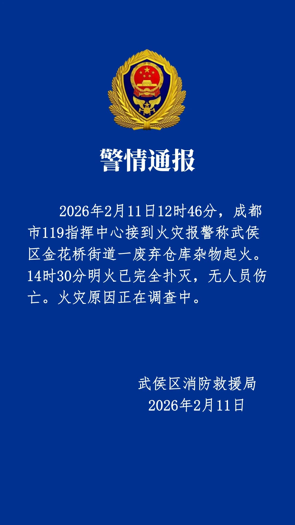 11日14时47分,成都武侯区消防救援局发布警情通报称,武侯区金花桥街道一废弃仓库杂物起火,14时30分明火已完全扑灭,无人员伤亡。另据成都双流国际机场核实,机场北围界外约2公里处发生火情,未对机场运行造成影响,航班起降正常。