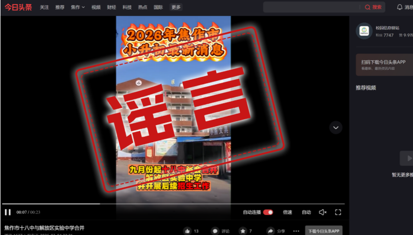 近期,某平台账号“校园信息驿站”发布图文称“焦作市第十八中学和解放区实验中学即将合并”,引发网民关注。